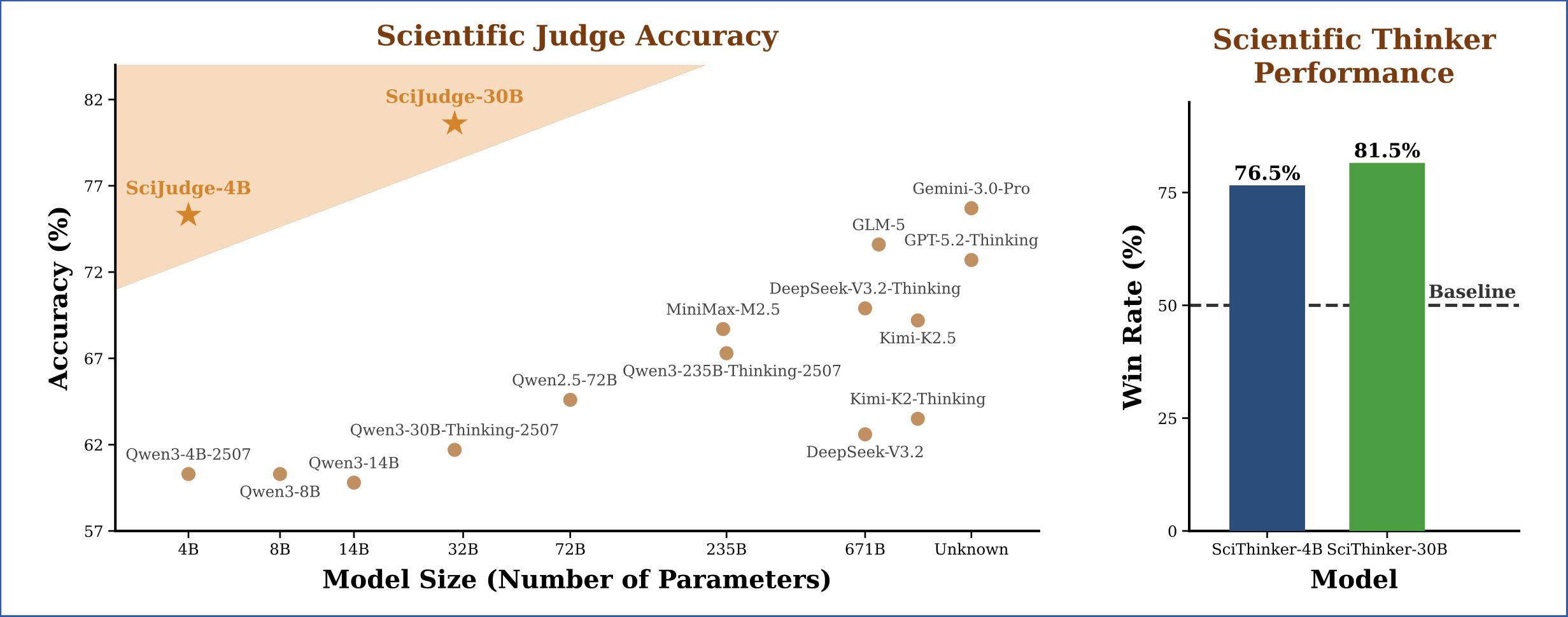 and generalizes to future-year test sets, unseen fields, and peer-review preference. Scientific Thinker further