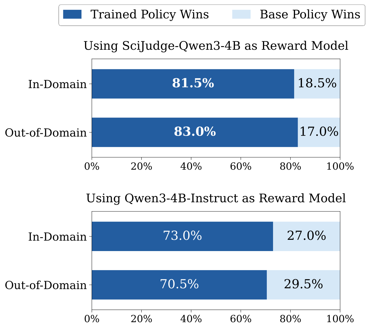 pairs of high- vs. low-citation papers. For preference alignment, using Scientific Judge as a reward model,